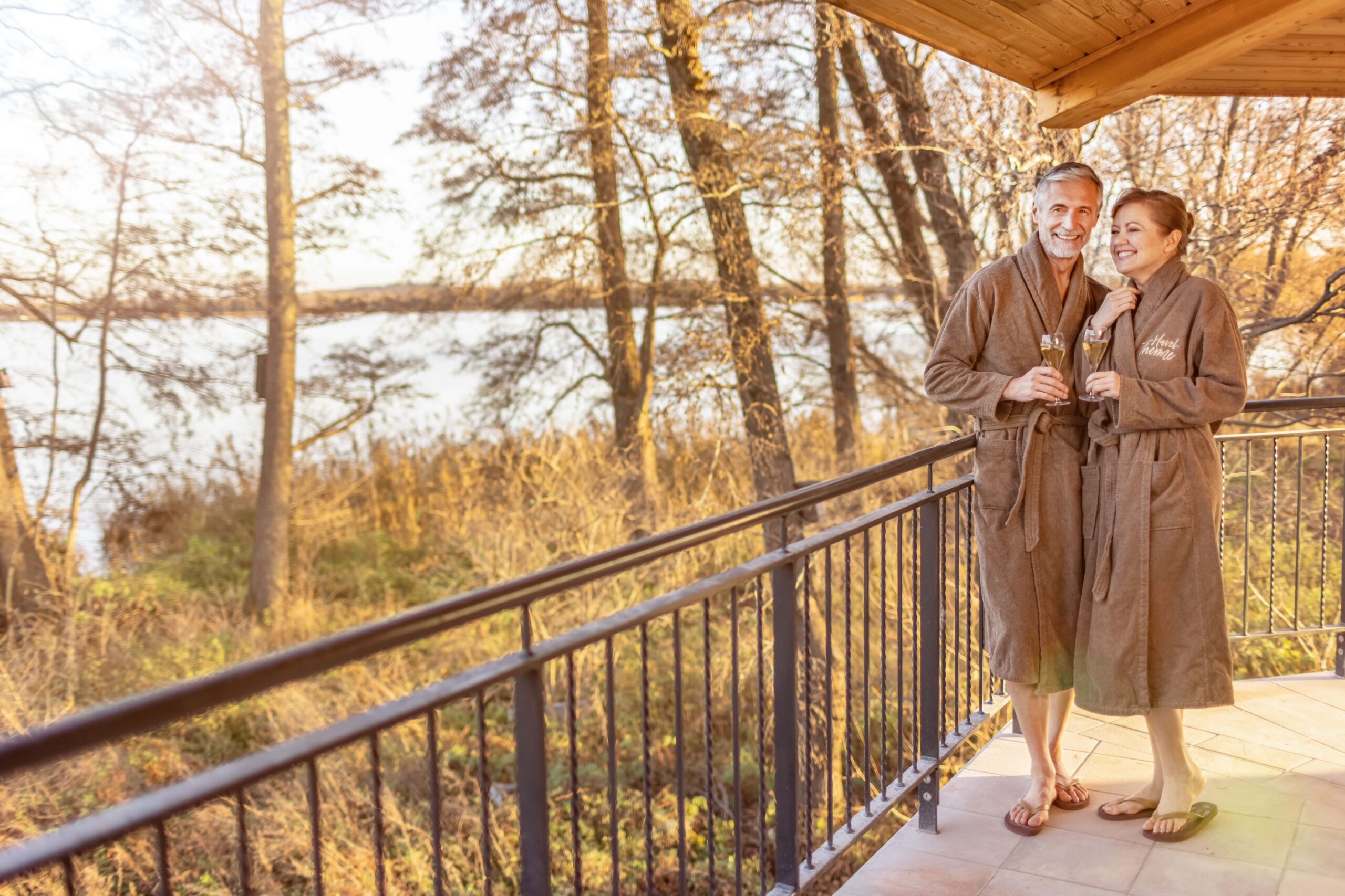 Wer Ruhe sucht, findet sie im Sauna- und Wellnessbereich mit insgesamt rund 13 Saunen und Dampfbädern. Hier wechseln warme Räume, großzügige Ruhezonen und kleine Rückzugsorte. Der lange Sauna-Steg, der in den See führt, verbindet die Therme mit der Havellandschaft. Am Steg liegt das Naturtauchbecken – ein direkter Wechsel vom Warmen ins klare Wasser. Und nach 160 Metern trifft man auf das Saunaboot ergänzt, das vor Anker liegt und Aufgüsse in einer besonderen Atmosphäre ermöglicht.
